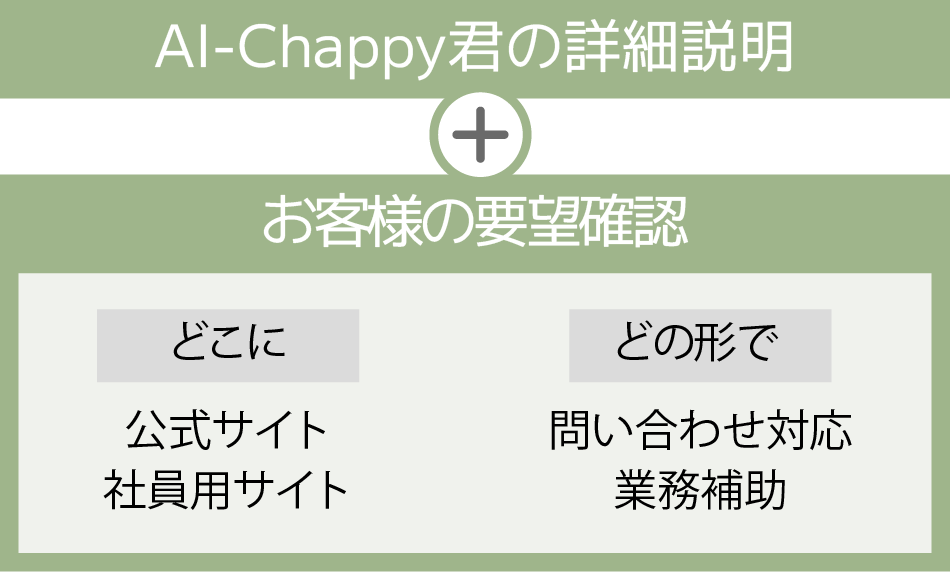 AI-Chappy君の詳細説明とお客様のご要望事項(どこにどのような形でAIアシスタントを設置してご利用されたいか?)を具体的にヒアリングさせて頂きます。